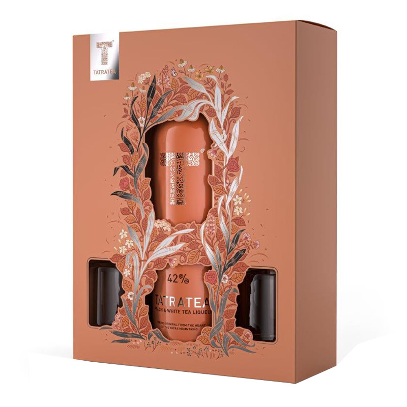 Tatratea Peach Tea Liqueur is a unique tea and herbal liqueur from the Tatra Mountains that comes in a gift set with two glasses.
