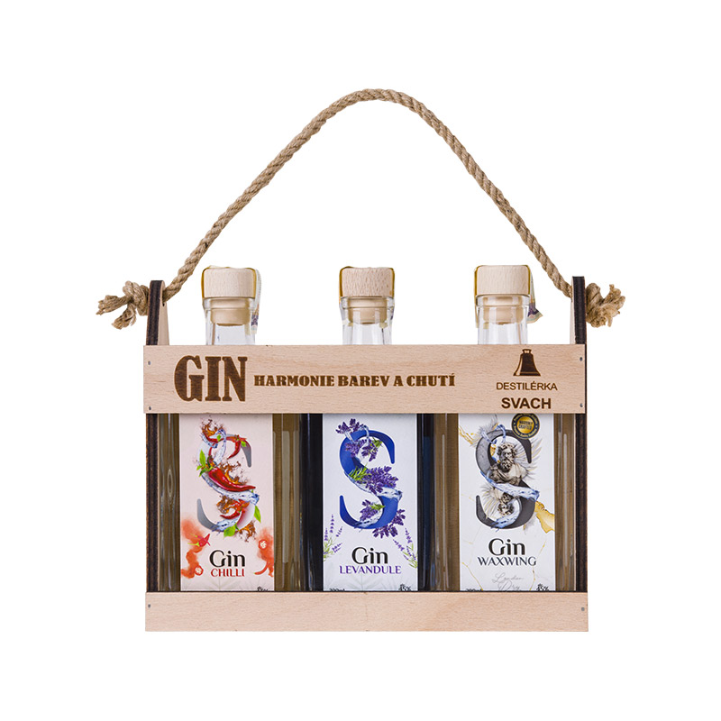 Svachovka Gin Set is a gift set of three unique gin variations from Svachovka, which is known for its creativity, attention to detail, and emphasis on quality. The set of three different gins in an elegant wooden box offers a unique tasting experience and is the perfect gift for gin lovers or as an original treat.