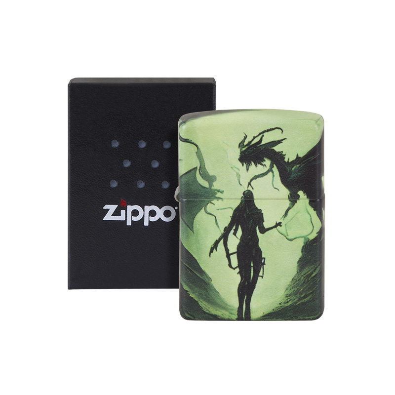 Strength, courage, and legend come to life in the Zippo 49193 Dragon Design lighter, which captivates with its dramatic design and mystical atmosphere. The 540 Color technology captures a scene of a hero facing a powerful dragon—dynamic, detailed, and utterly captivating.