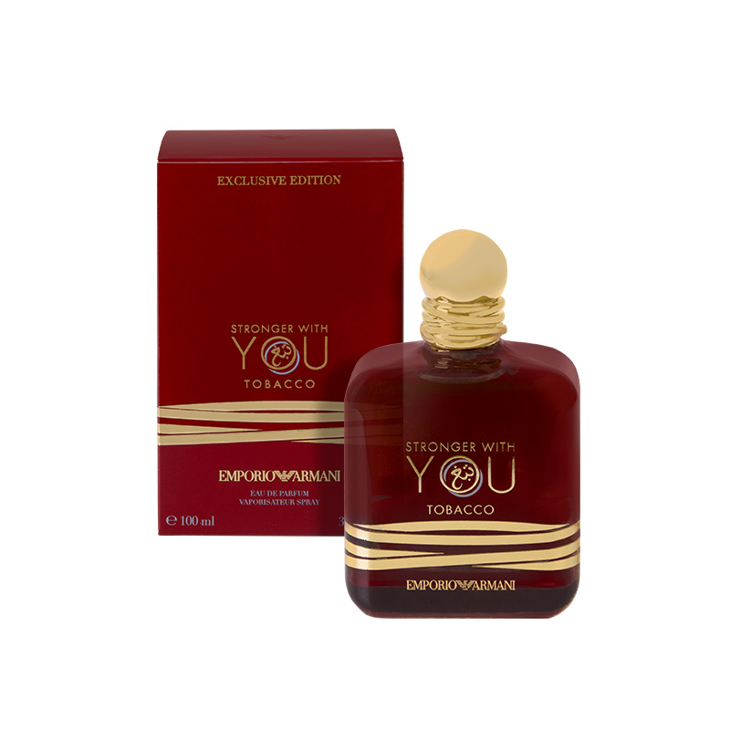 Stronger With You Tobacco unveils a new sensual and smoky interpretation of the original signature fragrance, encapsulated in a deep red and gold bottle, for a sensorial, passionate effect. Warm and inviting, STRONGER WITH YOU TOBACCO infuses the woody and ambery sensuality of a honeyed tobacco, captured in the intense and textured fougère structure. The fragrance opens with clouds of black pepper essence note, creating an intense and spicy effect. At the heart is the addictive tobacco absolute, blending with alluring notes of bold pimento and delicately spiced cinnamon leaves. The scent is contrasted by a warm ambery base with a captivating combination of balsamic vanilla bourbon extract and a sugar-coated chestnut accord. The scent is captured in the distinctive Emporio Armani STRONGER WITH YOU glass bottle, shaped with masculine refined lines and curves. The flacon is dressed in a radiant red tone to reflect its spice-infused ingredients and their sensorial, passionate effect.