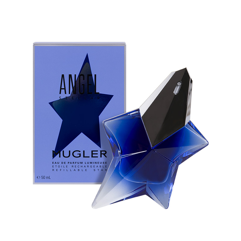 The iconic star-shaped bottle takes on a striking cobalt blue color, symbolizing the depth and mystery of the new Angel Stellar fragrance. The bottle is refillable, designed like a piece of jewelry that will last forever.