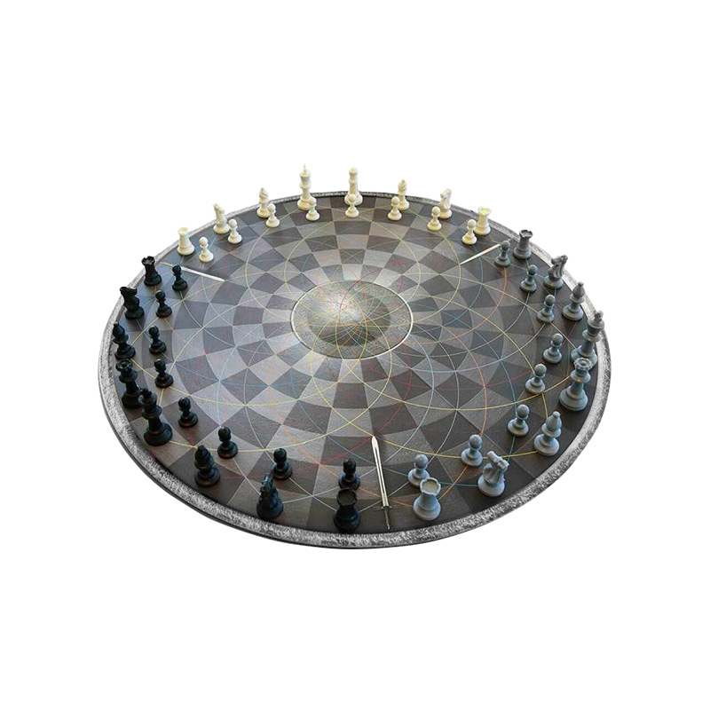 A specially designed circular chessboard with clearly marked diagonal trajectories ensures clarity even during complicated moves. Each player has their own color – white, gray, or black – and thanks to the lines on the board, orientation on the playing field is natural and intuitive.