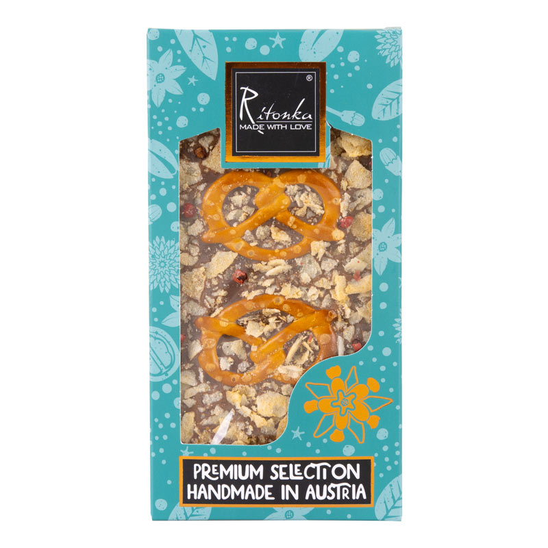 Milk chocolate, sugar, cocoa butter, whole milk powder, cocoa mass, emulsifier: soya lecithin, bourbon vanilla, red paprika, paprika-flavoured potato chips, potatoes, sunflower oil, rapeseed oil in varying proportions, salt, dextrose, breadcrumbs: wheat flour, yeast, water, salt, cheese powder(milk), paprika powder, maltodextrin, colour: paprika, acidity regulator: citric acid