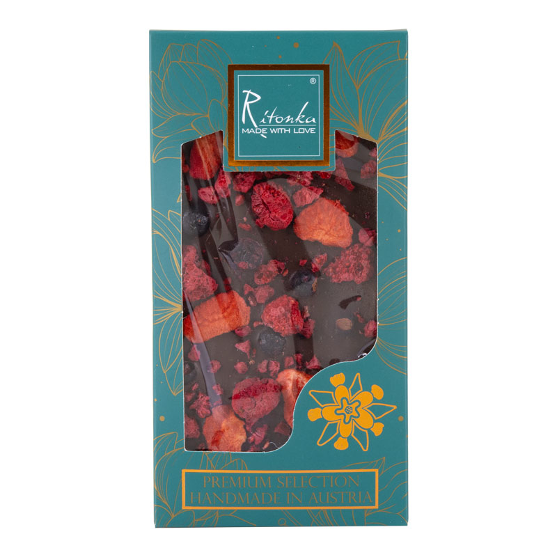 Ritonka PREMIUM Dark Chocolate Mix is a 65% dark chocolate with delicate floral notes and an aroma that will enchant all your senses. Ritonka PREMIUM Dark Chocolate – Forest Fruit Mix combines select cocoa beans from West Africa with an aromatic blend of forest fruits, giving this handmade chocolate freshness, color, and a fruity sparkle.