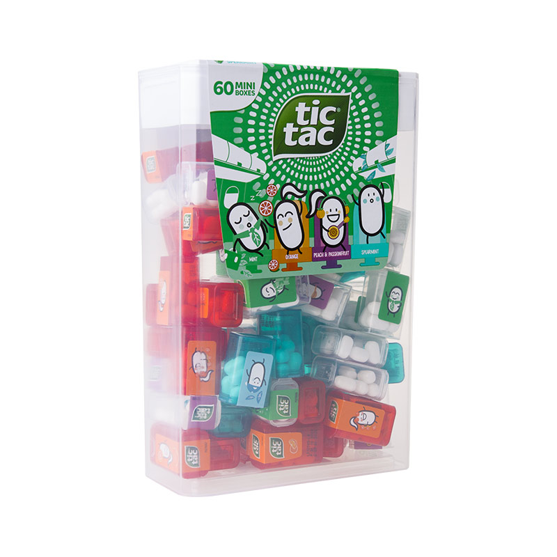 The smallest format in the biggest box! Tic Tac® Travel Exclusive Iconic Maxi box filled with 60 mini boxes, in a mix of 4 refreshing flavours: Mint, Orange, Spearmint and Peach & Passion Fruit.