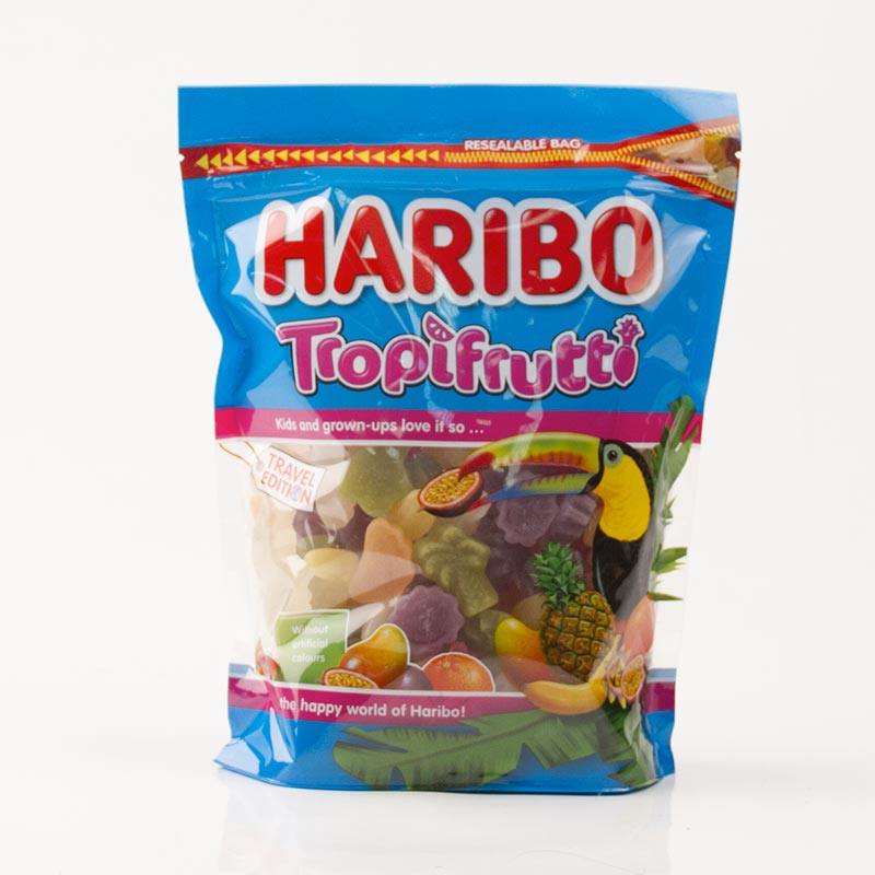 HARIBO Tropifrutti just makes life more tropical! Whether a toucan, a palm tree, a passion flower, a banana, a mango, a mandarin, a blackcurrant or a pineapple, treat yourself to the unique fruity fun of HARIBO Tropifrutti: sweet exotic jelly sweets ...